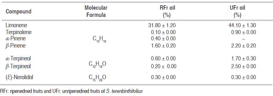 Table 1: Selected constituents selected identified in ripened and unripened fresh S. terenbinthifolius oils of the reported by Nascimento et al. (2012).