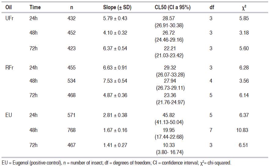 The fumigant method was the same used by Pontes et al. (2007). Glass recipients with a capacity of 1 L were used as test chambers, whit three replicates. One replicate consisted of 10 specimens of R. dominica. The oils were applied with an automatic pipette on a piece of filter paper (5 × 3 cm) attached to the underside of the recipient lid. The oil amounted ranged from 5 to 90 µL. Mortality was determined after 24, 48 and 72 h. Following exposure, the insects were then removed from the recipients, and were lightly touched with a brush in order to determine mortality. Those with no sign of movement were considered dead. The mortality data for each of the RFr and UFr oils were also analyzed with the Probit model using the POLO-PC software (LeOra, 1987) for the determination of the lethal concentration average (LC50) values, with 95% confidence levels determined for all experiments.