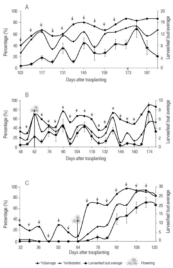 As expected, calendar-based insecticide spray applications, carried out even when larvae density was low, did not reduce larvae number. Paradoxically, larvae increased after sprays. Even in plot 1A, where sprays stopped 165 days after transplanting (DAT), 12 larva/leaf bud were recorded at the end of the cropping season (on day 190), a value close to the average number (13.7) recorded during the whole cropping season, suggesting the practically null effect insecticides had on larvae density. Likewise, in plot 1C, the average number of larvae/leaf bud increased from zero (64 DAT) to 20 (120 DAT), even after 8 applications of spirometramat.