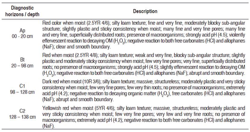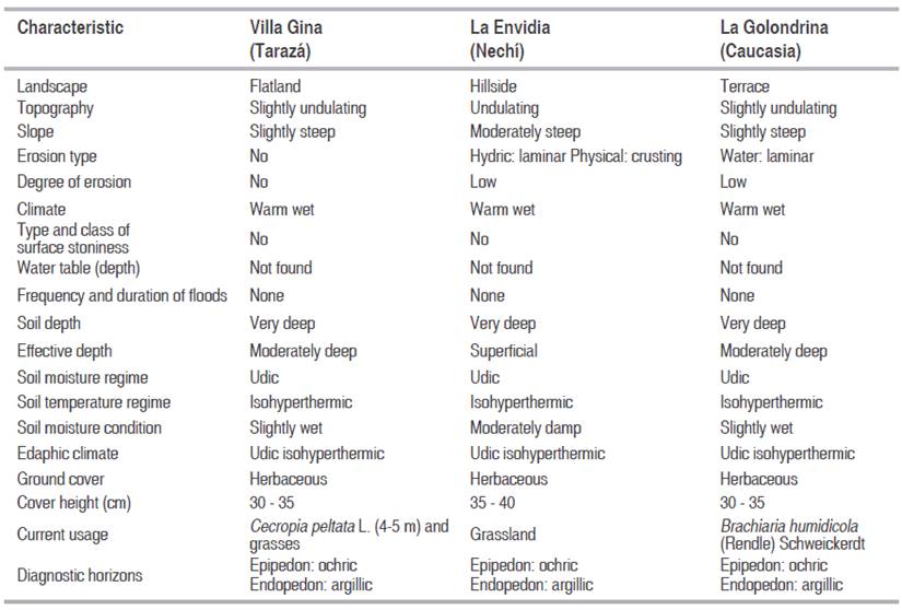 Table 1shows the characteristics of the three studied soils, which are representative of one of the major landscape units of Antioquia, namely the plains and low hills of the Cauca river basin. Resulting from ancient alluvial deposits brought by the tributaries of the Cauca river (Arbaux, 2003), this is one of the four main Colombian landscape types (IGAC, 1995). The characteristics observed at the sites of interest are the product of intimate soil-landscape correlation, wherein the stability of the geological formations and their constituent materials contribute to the evolution of the soils (Malagón, 2003) and represent the spatial and visual expression of the environment (Muñoz-Pedreros, 2004). This physiography is consistent with the views of Jaramillo (1996), who refers to the presence of three contrasting terraces in the region: a hilly and strongly dissected (upper) one, a number of flat or little dissected (medium and low) ones. These morphological differences are associated to different degrees of evolution. The warm and humid climate of the evaluated territory is described by Betancur et al. (2009) as particularly complex, due to the influence of the cyclonic curvature of the Caribbean waves, the proximity to the slopes of the western mountain range, and the effect of mid - latitude troughs.