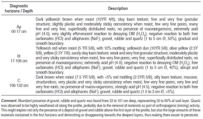 Comment: Abundant presence of gravel, rubble and quartz was found from 33 to 101 cm deep, representing 50 to 60% of said layer. Quartz was observed to be highly weathered all along the profile, probably due to the removal of materials as part of anthropogenic (mining) activity. This might explain not only the presence of a deposit of gravel and rubble above the first layer of the profile, but also the large amounts of these materials contained in the first horizons and diminishing or disappearing towards the deepest layers, thus making them easier to penetrate.