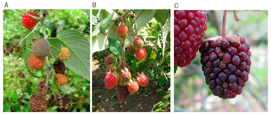 Figure 1: A. Blackberry fruits affected by gray mold (Botrytis cinerea). B. Blackberry fruits affected by downy mildew (Peronospora sp). C. Blackberry fruits affected by Anthracnose (Colletotrichum sp).