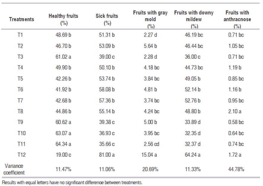 The results obtained through this research are the following: on the Absolute Control treatment (T12), the treatments that showed a higher percentage of healthy fruits, with no significant statistical differences, by the gray mold, downy mildew and Anthracnose diseases (Figure 1) were: T11, T10, T3 and T9 (Table 1). For this group of treatments, the percentage of sick fruits was between 35 and 39%; whereas the Absolute Control group presented an 81% of sick fruits. In this same group of treatments, the best results for the gray mold management were achieved with the use of T3 and T11 (with percentages between the 2.2 and 2.5%) in contrast to the Control group that presented a 15%. For the downy mildew the percentage of sick fruits was between the 32.3 and 36%, being the best treatments the T10, T11 and T9 in contrast to the Control group which presented a 64.2% (Table 1). Regarding the Anthracnose, the percentage of affected fruits was less than 2.1%. Treatment T8 did not show any difference from the Absolute Control T12, but both presented differences from the rest of treatments (Table 1).