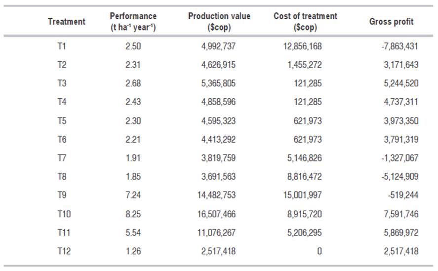 The highest production (t ha-1 per year) was reached on treatments T10, T9 and T11; however, when the costs analysis was made, it showed that the value of consumables for some treatments was considerable and affected negatively the profit; leading in some moments to produce losses, like can be seen on treatment T9.