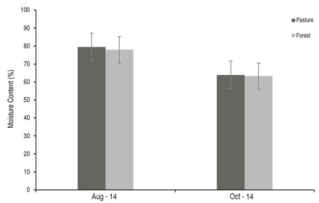 Figure 3: Moisture Content, average and respective standard error, obtained in the August and October campaigns of 2014 for different soil covers (forest and pasture), in the city of Itajaí (SC).
