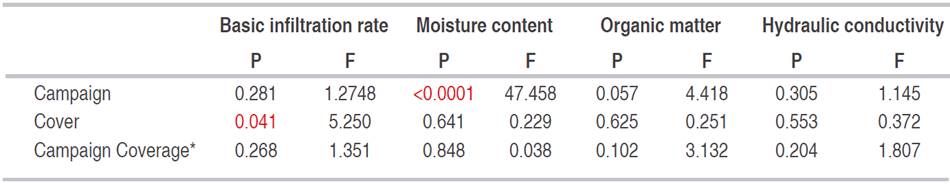 The analysis of variance proved to be significant for the factor campaign and can be explained by the occurrence of increased rainfall in the period. However, there were no significant differences between the soil covers, which suggests the same moisture condition of the analysed soil samples. According to Araújo and Reis (2014), the accumulated volume in August (118 mm) was higher than the accumulated volume of October (63 mm). Therefore, the result of greater moisture in the first campaign is expected.