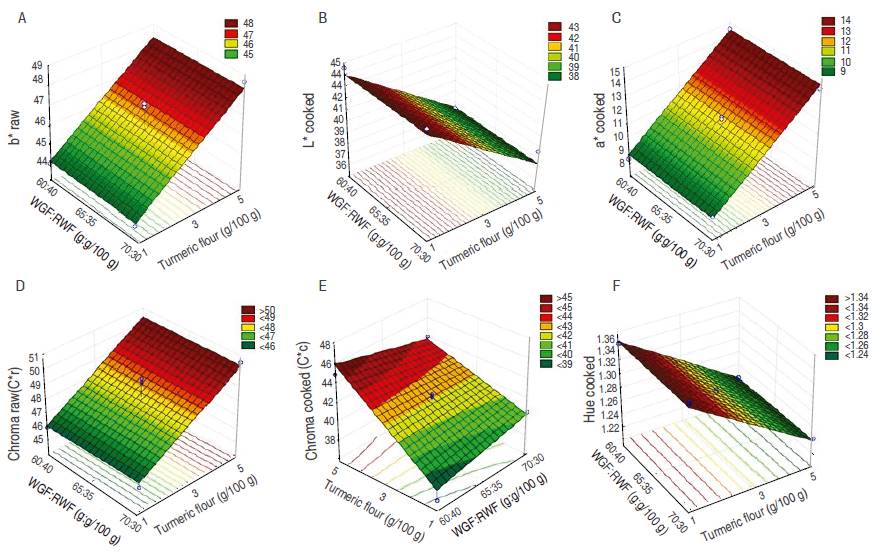 Figure 2: Response surfaces from experimental design for turmeric pastas (TP). A. Color b* for raw TP; B. Color L* for cooked TP; C. Color a* for cooked TP; D. Chroma for raw TP; E.Chroma for cooked TP; F. Hue for cooked TP. WGF: Whole grain wheat flour; RWF: Refined wheat flour.