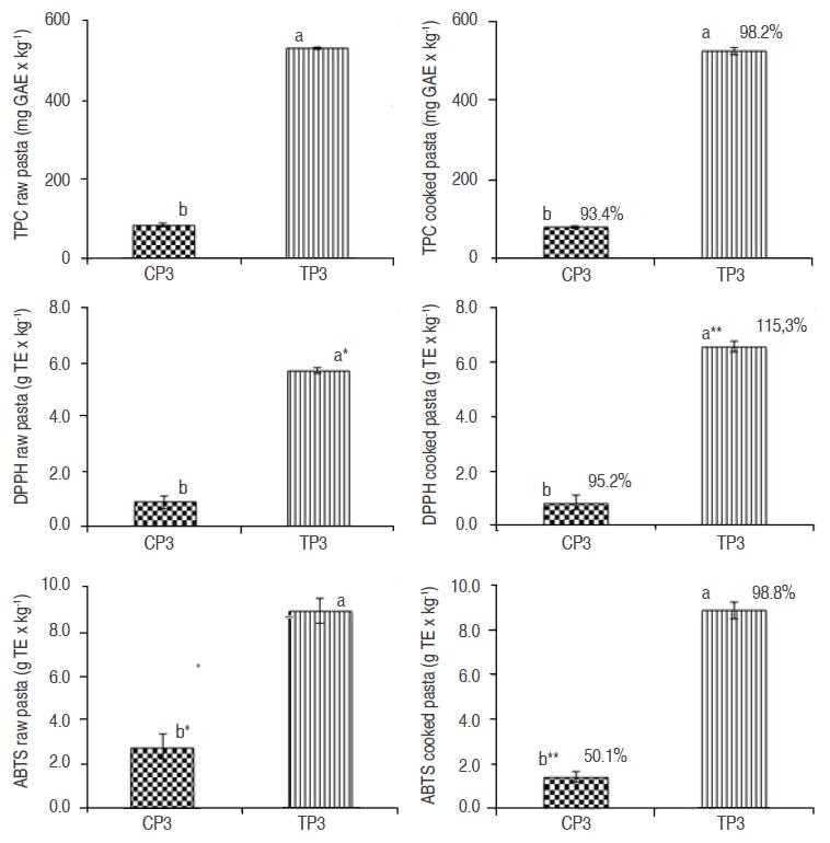 The analysis of total phenolics content (TPC) showed that raw TP3 presents the highest value of TPC (534.46 ± 1.93 mg kg-1 TPC, db), being it more than six times the value present in CP3. TPC retention after cooking was superior to 93% in all pastas.