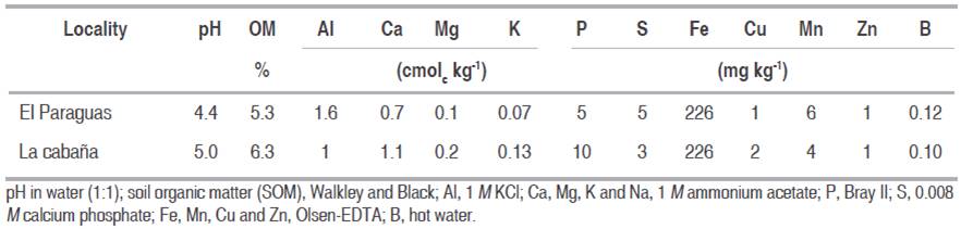 The soils where the tests were sown, showed Ar and FArA textures, extremely acidic, with low contents of organic matter (OM), low P availability, low in K, Ca, Mg, S, Zn, B, Cu and rich in Fe and with medium contents of Al (Table 1). In general terms they are soils of low fertility.