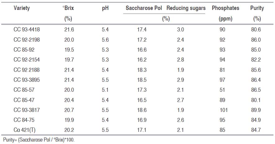 The purity of the juices in most varieties presented values higher than 80%, where the highest was CC 93-3817 with 89.9% (Table 5); according to Corpoica (2007) purity ranges must be between 82 and 95%.