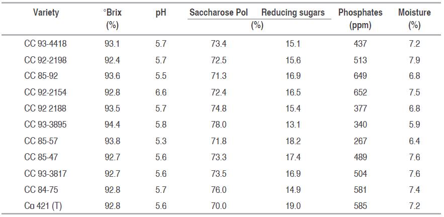 In the juice of the cane are dispersed multiple substances, in addition to saccharose and reducing sugars; the proportion of these substances differs with each variety (Zossi et al., 2011). In the juice, soluble solids content or °Brix ranged from 19.70 for the CC 92-2154 variety and 21.60 for the CC 93-4418. According to Larrahondo (1995) and Duran and Zapata (1992), °Brix of juices should normally fluctuate between 16 and 24, a range in which the varieties evaluated in this study were found, standing out the materials CC 93-4418, CC 92 2188, CC 93-3895 and CC 93-3817 (Table 5); According to Duran and Zapata (1992) these are cataloged as ripe canes.