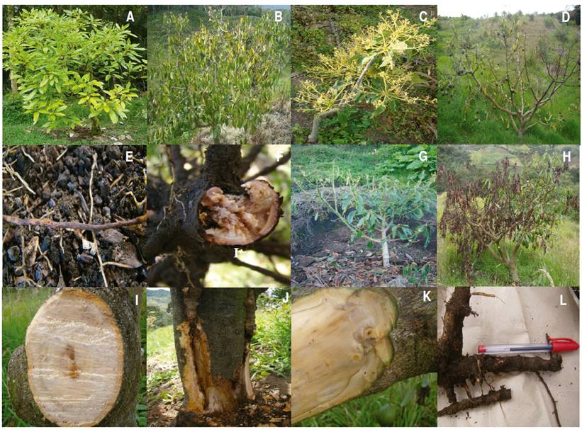 Figure 2: General and specific symptoms associated with avocado wilt complex and their causal agents. A to F. General symptoms associated with AWC; G to L. Specific symptoms associated with AWC; A and B. Generalized yellowing and wilting of the leaves caused by Phytophthora cinnamomi; C and D. Excessive flowering, fructification of low quality in adult trees, defoliation, and dieback caused by hypoxia-anoxia and Phytophthora cinnamomi respectively; E and F. Secondary, tertiary and primary root rot caused by Phytophthora cinnamomi and Phytophthora citricola respectively; G. Wilting and leaf loss caused by hypoxia-anoxia; H. Hemilateral wilting and yellowing caused by Verticillium sp.; I. Pith rot caused by Lasiodiplodia theobromae; J. Cankers at the base of the stem by Phytohpthora heveae; K. Brown coloration in the vascular bundles caused by Verticillium sp.; L. Root atrophy.