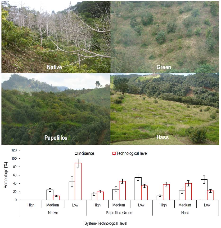 The magnitude of AWC in Colombia is evident in all of the production regions, where it has devastating effects and can destroy a great quantity of plants in short period of time, causing numerous losses which have yet to be quantified (Figure 3). In this sense and based on evaluations carried out in different regions of Colombia, it has been found that incidence of AWC was associated with different factors within the productive systems, especially those related to technological level (TL) (Figure 3). This concept (TL) is associated with a series of agronomic practices and management of the avocado system, which have been identified through statistical and mathematical relationships with different levels of incidence, severity and mortality of AWC (Ramírez-Gil et al., 2017a; Ramírez-Gil et al., 2014a).