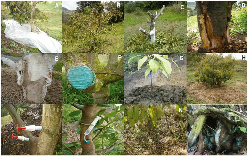 Figure 6: Physical, microbiological and chemical management strategies in avocado wilt complex. A. Solarization; B. Plant with P. cinnamomi in stage 4 of disease development scale; C. Severe pruning for management of P. cinnamomi; D. Cankers in the base of the stem caused by P. citrícola; E, F. Cankers surgery and application of a waterproof, curative and preventive pasta; G, H. Addition organic material and mulching in the planting area; I, J. Application of a fungicides with phosphite how active ingredient into the stem using injectors and clinical syringes; K, L. Application of a fungicides with metalaxil how active ingredient in drench and powder in the cankers the stem. The phots are representation of many practices associated with AWC management under assays in field developed by the author.