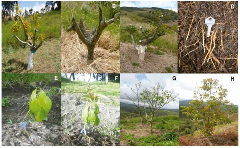 Figure 7: Results of management practices in avocado wilt complex. A. New leaf buds after performing severe pruning; B. Dead plant after performing severe pruning; C. Recovery of plant infected with P. citricola after performing surgery and complementary treatment; D. Induction of viable roots in plants with added mulching; E, F. Seedling infected with P. cinnamomi, and recovery after implementation of integrated management strategy; G, H. Adult infected with P. cinnamomi, and recovery after implementation of integrated management strategy. The phots are representation of results associated with AWC management under assays in field developed by the author.