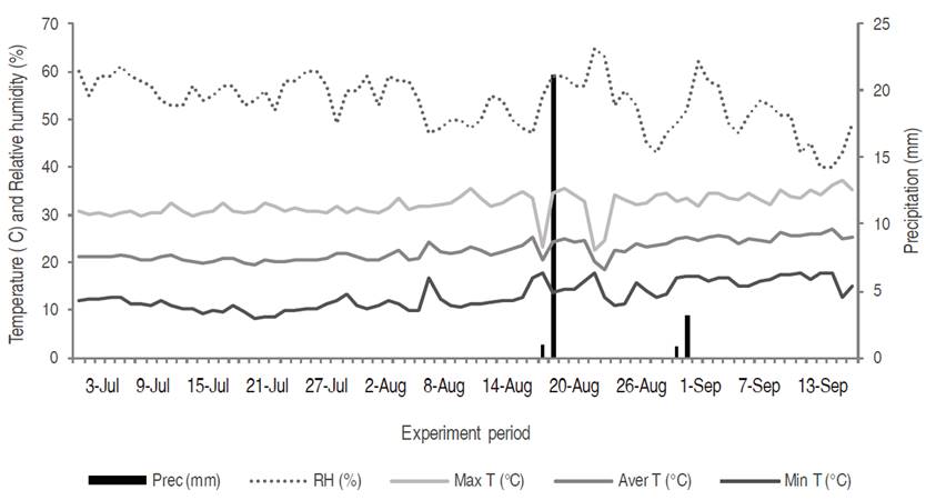 Figure 1: Climatic conditions of relative humidity, maximum, average and minimum temperature and precipitation during the period of conduction of the study.