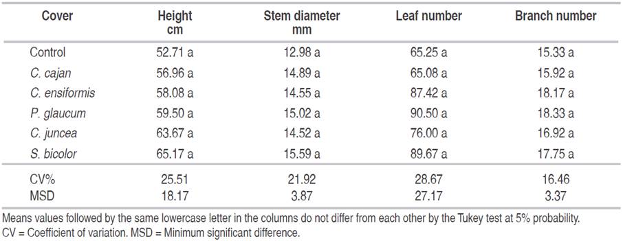Table 1: Mean values of height, stem diameter, number of leaves and number of branches of crambe plants grown on residual of different cover crops.