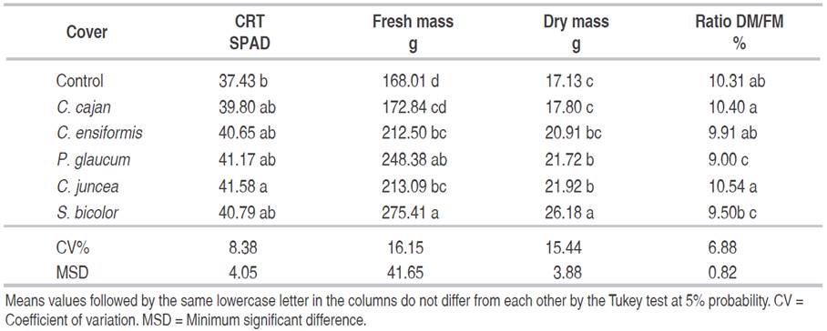 Table 2: Average values of the relative content of chlorophyll (CRT), fresh and dry shoot mass and ratio between dry mass (DM) and fresh mass (FM) of crambe plants grown with different cover crops residues.