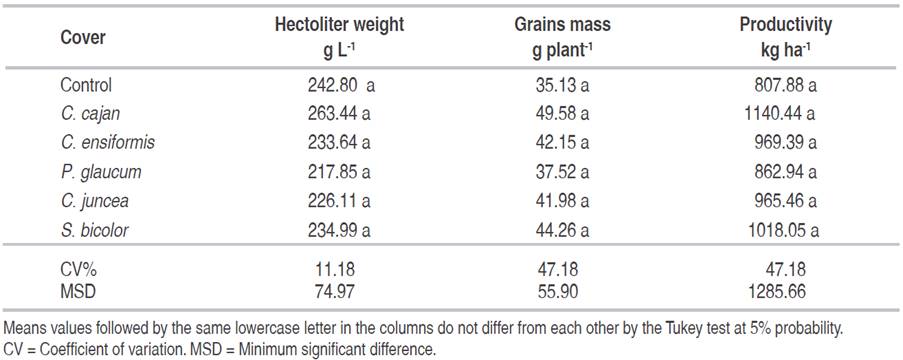 The productive parameters were not affected by the cover crops residues. Average values of 236.47 g L-1 were obtained for the hectoliter weight of harvested grains, in addition to a mass of 41.77 g per plant and an estimated yield of 960.69 kg ha-1 (Table 3).