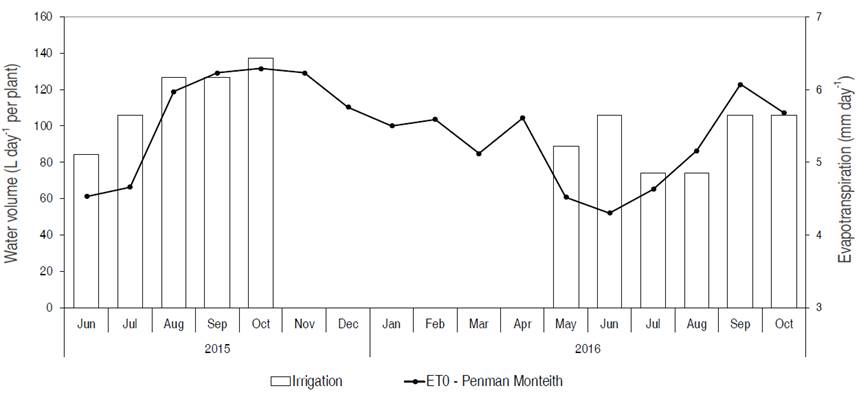 For the dry period of 2015, the volumes of water replenished by irrigation were 84.50, 105.63, 126.75, 126.75 and 137.31 L d-1 per plant from June to October, respectively. In 2016, 88.73, 105.63, 73.94, 95.06 and 95.06 L d-1 of water per plant were replenished from May to October, respectively (Figure 1).