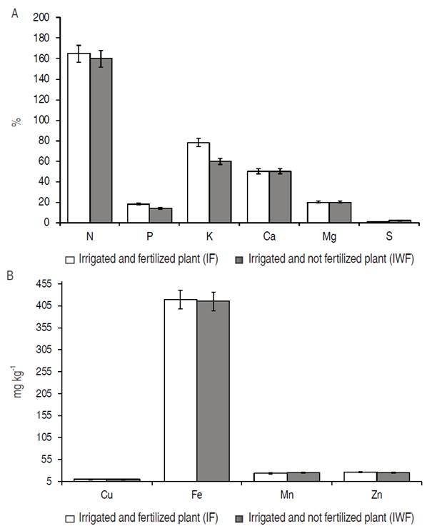 Figure 2: A. Macronutrients content; B. Micronutrients content in the plant tissue of pequi plants (Caryocar brasiliense Camb.) cultivated using irrigation and organic fertilization (IF) and irrigation without organic fertilization (IWF).