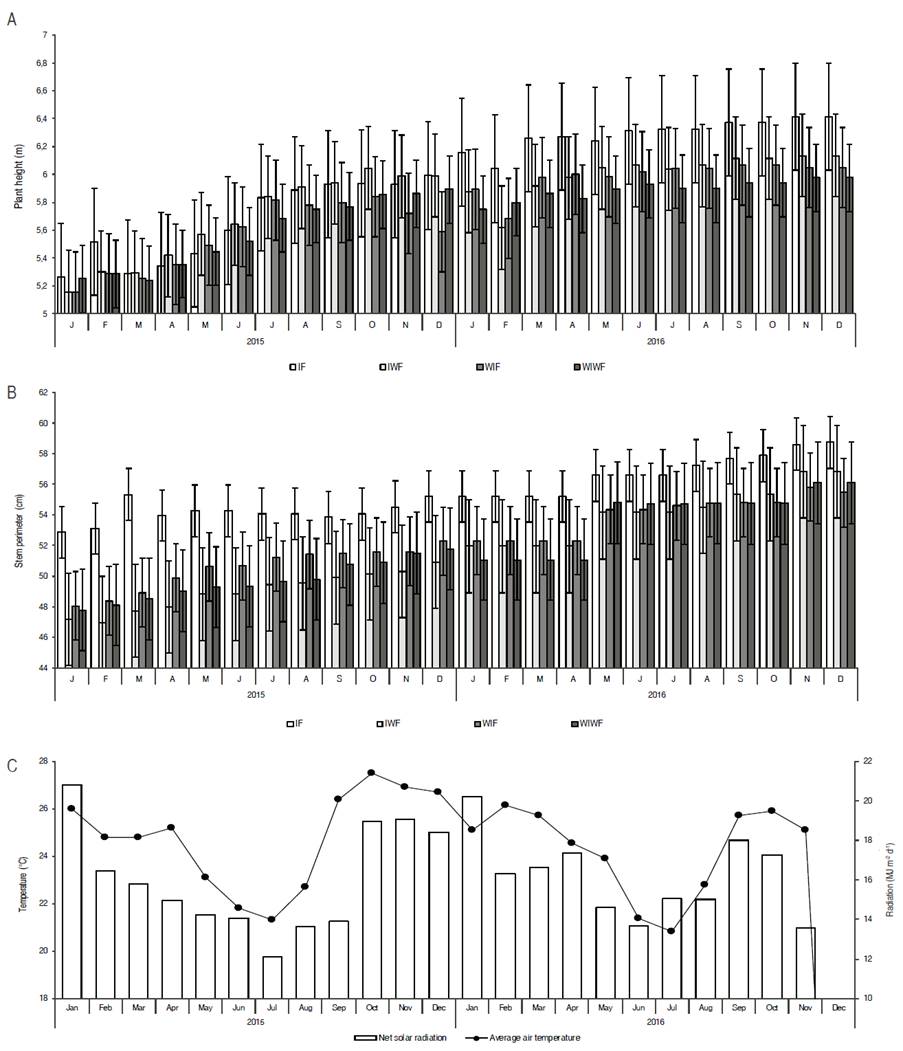 Variations in stem perimeter were monitored monthly between Jan/2015 and Dec/2016. A tape measure was used to measure the stem perimeter at 0.10 m from the soil surface. Monthly, plant height was also measured using an electronic forest clinometer from the soil surface to the highest branch of the plant.