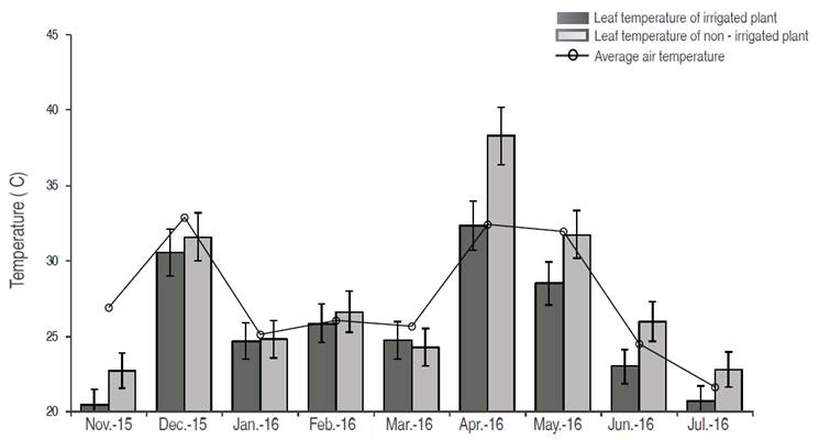 Figure 4: Average air and leaf temperature of pequi trees, irrigated and not irrigated, cultivated in an experimental orchard, between the ages of 6.10 and 7.6 years.