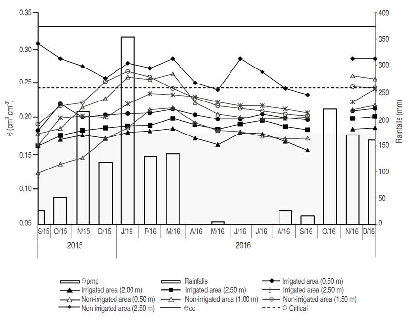 In the non-irrigated area, at a 0.50 m depth, soil water content remained below the θpmp until Oct/15. Thereafter, it presented increasing values, remaining above the θcritical, then decreasing again until Apr/16, when it remained below the θcritical. This was due to rainfalls. With the beginning of rains in Oct/16, the soil water volume at the 0.50 m depth presented the same increasing tendency. At the 1.00 m depth, there was an analogous behavior. However, the contribution of rainfalls was sufficient to raise the soil water content little above θpmp between February and April and November and December 2016. At 1.50 and 2.50 m, the soil water content, although below θpmp in Sep/2015 with the onset of rains in October of that year, remained above the θcritical between December 2015 and April 2016 at the depth 1.50 m and between February and April 2016 at the depth 2.50 m.