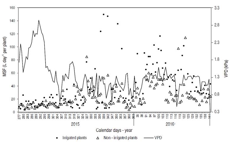 On average, the volume of water the orchard received by irrigation was 116.95 L d-1 per plant in 2015 and 92.24 L d-1 per plant in 2016, corresponding to a water depth of 9.36 and 7.38 mm, respectively. During this period, the contribution of rainfalls to the water volume received by the orchard was 0.55 mm (2015) and 1.48 mm (2016), while evapotranspiration (ETo) presented values of 5.67 and 5.22 mm d-1, respectively. Thus, the balance between the water volume received by the orchard and evapotranspiration during the same period presented a negative balance for non-irrigated plants.
