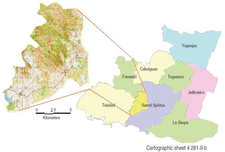 The study was carried out in Banao community in the Sancti Spiritus Province, which is located to the south in the central region of Cuba, between X: 216 000 - 218 000 and Y: 539 000 - 550 000 according to the rectangular plane coordinate system of Northern Cuba, cartographic sheet 4 281-II-b (Figure 1). This experimental area (“Hermanos Alonsos”) has suffered anthropic action for more than 30 years, despite the high income generated by the production of onions (Allium cepa L.). The production levels obtained in the last years have compromised the ecosystem’s stability and as a vulnerable factor increased soil erosion (Figure 2).
