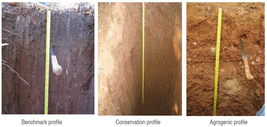 Our study shows that all soil properties were markedly different between native forest (Benchmark) and the continuous cultivation (Agrogenic). The other land types increased bulk density, decreased field capacity, organic matter, porosity and structural index. Continuous cultivation caused the degradation of the topsoil eventually reaching a 50 cm depth which leads to a greater compaction, porosity limiting and humidity reserve. Benchmark profile did not present significant differences with the conservate profile which we attribute the No-till policy and adequate rest time. Establishing pastures could help reduce bulk density and improve the soil physical properties.