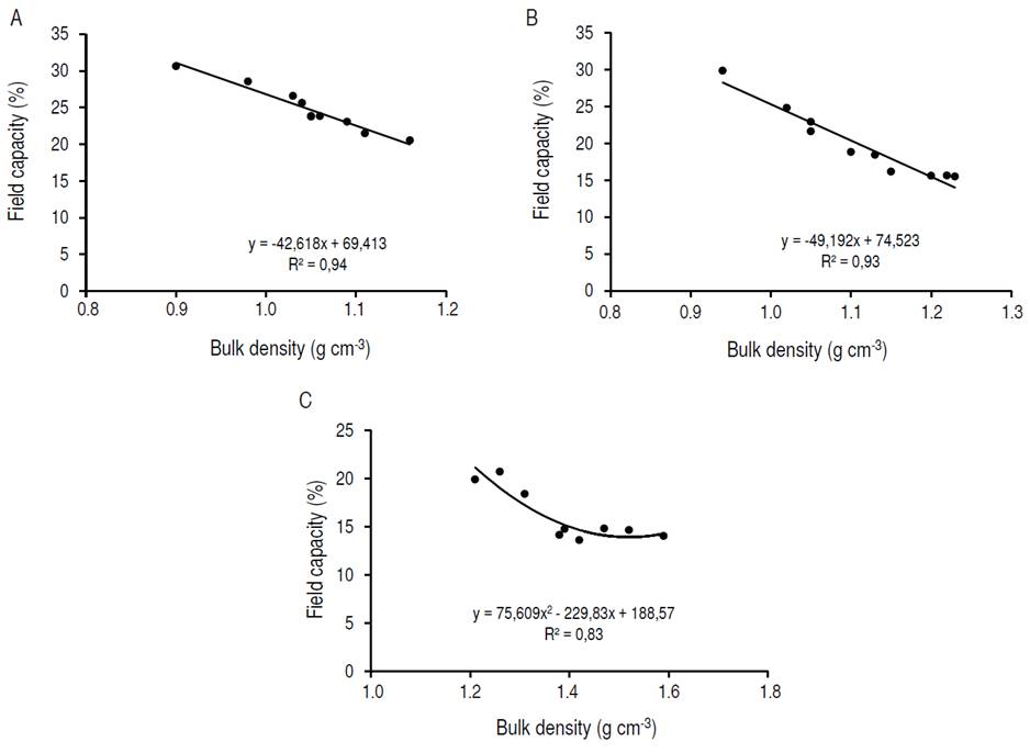 According to the regression analyses, as the bulk density increases, the field capacity decreases and the observed tendency is linear for Benchmark and Conservation soils (R 2=0.94) and (R 2=0.93) respectively (Figure 4A, B). That is, the field capacity decreases 42.6% for Benchmark profile and 49.1 % for Conservate profile for each unit of soil bulk density variation. It a polynomial regression can be observed For the Agrogenic profile (R 2=0.83) (Figure 4C). This non-linear behavior corresponding to the Agrogenic profile could be influenced by higher values of bulk density, presenting a greater soil compaction, lower structural index, organic matter content and porosity coinciding with a compacted soil according Martin and Duran (2011) as was previously described.