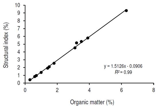 The organic matter content and the structural index shows a linear relationship with high degree of dependence (R 2=0.99). Therefore, with increasing organic matter the structural index increases and vice versa (Figure 5). This relation may be more dependent for this type of soil dominated by oxides and 1: 1 mineral compared to soils dominated by 2: 1 mineral (Six et al., 2000). It should be noted that predictions made by using the regression line fitting (R 2=0.99) obtained in this figure produced practically the same results as the regression on individual soil management.