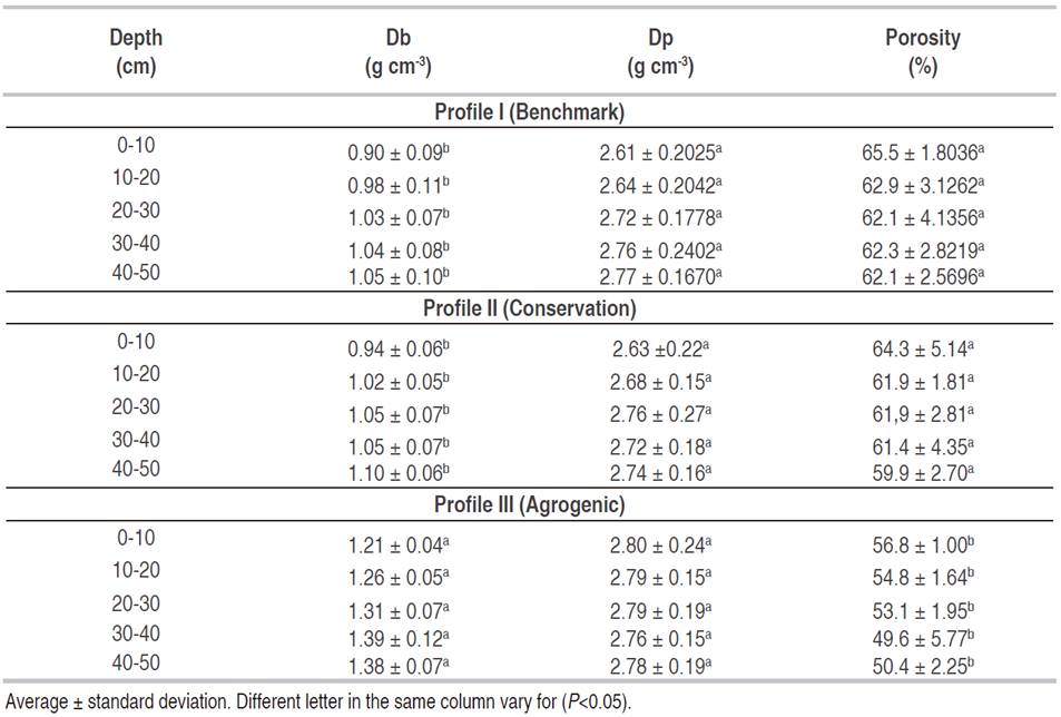 The results demonstrated that the soils in this study presented differences in their physical properties due to its land utilization (Table 1). According to (Hernández et al., 2010), soil degradation processes increase where the management practices are selected without regard for the edaphological conditions, which are specific to every particular region. Benchmark topsoil (0 - 10 cm) had a mean (± standard deviation) bulk density of (0.90 ± 0.09 g cm-3), which was similar to that of topsoils taken from conservation profile (0.94 ± 0.06 g cm-3). The mean bulk density for Benchmark and Conservation profile were lower (P<0.05) than the bulk density values for agrogenic profile (1.21 ± 0.04 g cm-3). Bulk density values both for Benchmark and Conservation profile are considered normal, whereas for the agrogenic profile the soils are considered compacted according to Martin and Duran (2011). A tendency towards a lower bulk density for soils taken from Benchmark and the conservation profile system compared to those from agricultural land uses (agrogenic) could also be detected for the 10-50 cm (Table 1). Compaction, measured by increased bulk density, often accompanies structural degradation as soil porosity and pore size are reduced through physical compression and decreased organic matter. According to Homburg and Sandor (2011) in the Mimbres study, bulk density increased about 9% relative to uncultivated soils and may not have been a major problem, but that degree of compaction has been shown in experiments to inhibit maize seedling development and root elongation, especially in fine-grained soils.
