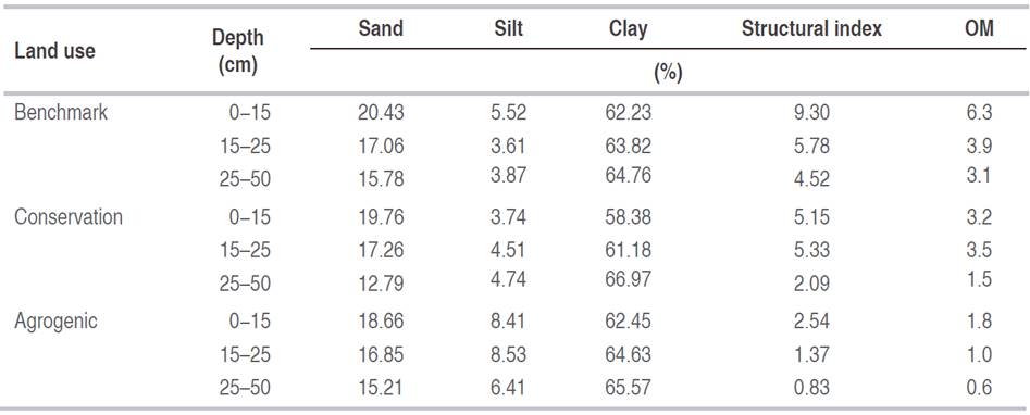 The texture of all land types and depths were predominantly clayey, with the clay content increasing with depth (Table 2). The Soils of all depths sampled were classified as (Nitisol Rodico Eutrico) based on (IUSS, 2014). On average, soils from the lower depths (25-50 cm) contained slightly less sand and slightly higher clay content (Table 2). According to Homburg and Sandor (2011) structure degradation is signaled by loss of granular structure, weaker structure grade, tendency toward larger aggregates (peds) and massive condition. These differences appear to be due to intensive anthropogenesis experienced by the soils which was not sub soiled in the last years. It is therefore reasonable to infer that the soil compaction is conditioned by the history of land use and management. According to Olivera (2017), as soil compaction increases under heavy farm machinery, the soil physical structure deteriorates, bulk density increases and total porosity decreases.