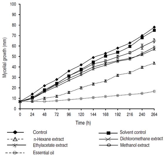 The inhibitory effects of organic extracts and essential oil of P. crispum at 400 μg mL-1 on the growth of C. acutatum are presented in Figure 1. All extracts displayed a significant inhibitory effect in the growth of C. acutatum after 264 h. In general, the growth of fungal mycelium was dependent of the type and amount of extract in the culture medium. The n-hexane extract caused the least growth of C. acutatum; after 264 hours, the radial growth was almost 30 mm less than the control. Higher polarity extracts, methanol followed by ethyl acetate, had the lowest inhibitory effect on C. acutatum. After 72 h, the n-hexane extract showed an inhibition percentage of 57%. Then, the fungistatic effect presented a slight decrease, reaching 48% inhibition after 264 h.