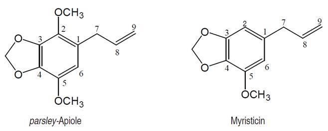 Parsley-apiole: The compound was isolated as a yellowish oil; C12H14O4. EI-MS m/z: 222(100)[M]+, 207 (26), 195 (11), 191 (11), 177 (18), 149 (16). 1H NMR (300 MHz, CDCl3): δ 6.32 (1H, s, H-2), 5.95 (2H, s, -OCH2O-), 5.90-6.00 (1H, m, H-8), 5.08 (1H, dd, J = 1.5, 12.9, H-9b), 5.03 (1H, dd, J = 1.5, 9.6, H-9a), 3.89 (3H, s, -OCH3), 3.86 (3H, s, -OCH3), 3.31 (2H, dd, J = 1.5, 6.3, H-7). 13C NMR (75 MHz, CDCl3) δ: 138.9 (C-3), 138.6 (C-5), 137.2 (C-8), 136.1 (C-2), 135.0 (C-4), 125.6 (C-9), 115.1 (C-1), 108.1 (C-6), 101.3 (-OCH2O-), 59.9 (-OCH3), 56.7 (-OCH3), 33.9 (C-7).