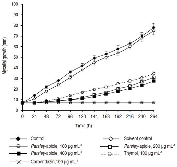 Antifungal activity of isolated compounds was evaluated for C. acutatum. Results are presented in Figures 3 and 4. The myristicin (a phenylpropanoid with one methylenedioxy and one methoxy group) presented a moderate fungistatic activity for all the evaluated concentrations, as compared to thymol and the carbamate carbendazim®. However, it was observed that even at the concentration of 100 μg mL-1, myristicin presented a significant reduction of mycelial growth of the microorganism, as compared to the control and solvent control. In general, the fungistatic activity of myristicin was concentration dependent. At 200 μg mL-1, the inhibition percentage was greater than 35%, even after 264 h. At this time, the concentration of 400 μg mL-1 showed a 55% inhibition.