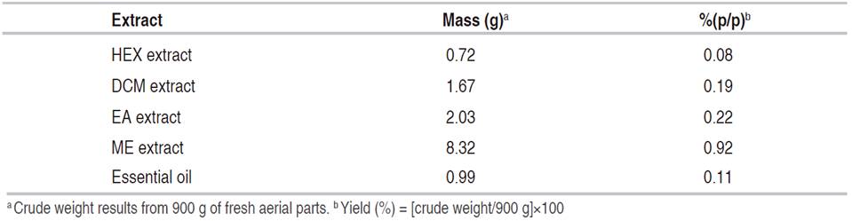 Table 1 shows the extraction yield for the four solvents of different polarities -n-hexane (HEX), dichloromethane (DCM), ethyl acetate (EA), and methanol (ME)-, and the essential oil (EO) collected by hydrodistillation from P. crispum. The order of increasing yield was HEX < DCM < EA < ME, coinciding with a growing polarity of the extracting solvent. Thus, the highest yield was achieved by the most polar solvent, methanol. The n-hexane extract presented approximately 10 times less of the weight reached by the methanol extract. This suggests that the proportion of low polarity products extractable with hexane in P. crispum is low, compared to those of high polarity present in extracts in ethyl acetate and methanol. The yield from essential oil hydrodestillation extraction was closer to the extraction yield from n-hexane. Overall, the total amount of extractable material with organic solvent in P. crispum was 13.73 g (1.42%).