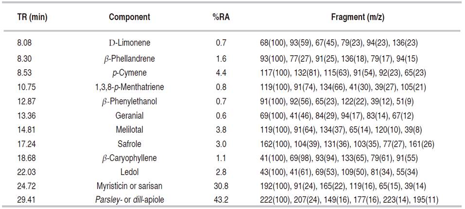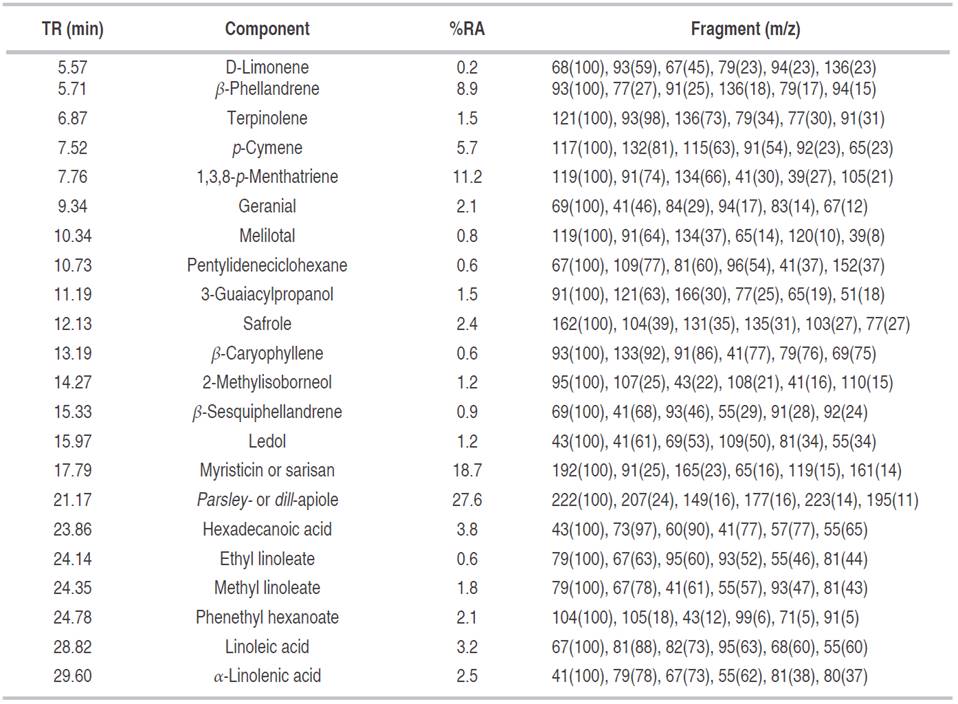 Table 2: Relative abundance (%RA) of major compounds obtained by GC-MS (%) from n-hexane extract of P. crispum.