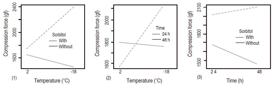 The variance analysis performed for the texture parameters obtained indicate that there was a significant difference between treatments (P<0.05). The Tukey test suggests that the treatments subjected to the incorporation of sorbitol -18 °C for 24 and 48 h (T4 and T8) obtained the highest compression force value and did not present significant difference among them (Figure 1).