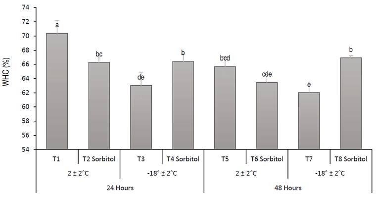 The analysis of variance performed for the WHC parameters obtained shows that there was a significant difference between treatments (P<0.05). The Tukey test indicates that the treatment subjected to 24 h at 2 °C without the incorporation of sorbitol (T1) obtained the highest WHC (70.4%), while the treatments T3 (-18 °C for 24 h) , T5 (2 °C for 48 h), and T7 (-18 °C for 48 h), that also did not include the incorporation of sorbitol, presented statistical similarity among them and low WHC with values of 63.05, 65.7 and 62.01%, respectively. Being the lowest value, the one obtained for T7. The treatments that used the sorbitol incorporation T2 (2 °C for 24 h), T4 (-18 °C for 24 h), T6 (2 °C for 48 h), and T8 (-18 °C for 48 h) had WHC values of 66.30, 66.47, 63.46, and 66.92, respectively; these treatments were statistically similar except for T6 (Figure 3).