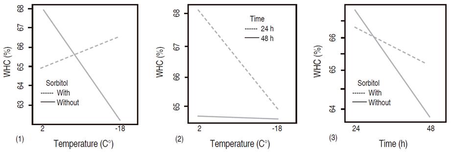 The interaction of the incorporation or not of sorbitol at different storage times and temperatures of yamú’s meat (Brycon amazonicus) affected the variable WHC (Figure 4). These values were influenced by temperature and storage time (P<0.05); the interaction between the incorporation of sorbitol with storage temperature also presented a significant effect (P<0.05) because the WHC presented the lowest value when the meat was stored at -18 °C without the incorporation of the cryoprotectant, while this characteristic remained when the meat was treated with sorbitol. The interaction between temperature and storage time (P<0.05) showed that, independently of the storage temperature, WHC decreases after 48 h for all treatments, especially for those who were not treated with sorbitol.