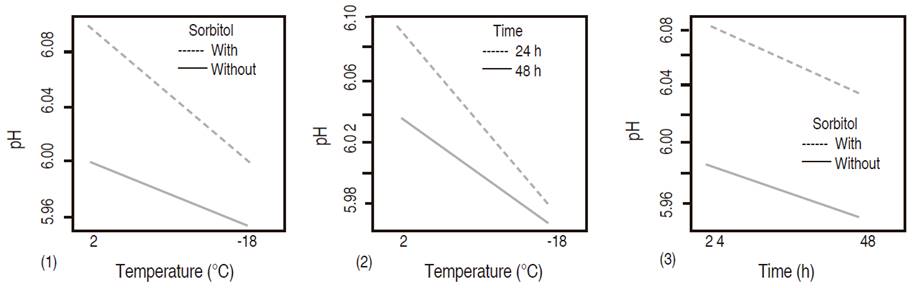 The pH is higher when sorbitol is added to the yamú meat, regardless of the storage time. However, in the absence of sorbitol, storage at -18 °C causes a reduction in pH, especially when this is prolonged by 48 h. The decrease in pH during storage indicates the transformation of muscle glycogen into lactic acid during the post-mortem stage (Einen et al. 2002). Similarly, a low pH is directly related to the loss of texture (Ang and Haard, 1985; Kiessling et al., 2004) due to the weakening of connective tissue and protein denaturation (Lavéty et al., 1988). The pH remains stable during storage for 48 h when sorbitol is incorporated in the meat subjected to -18 °C.