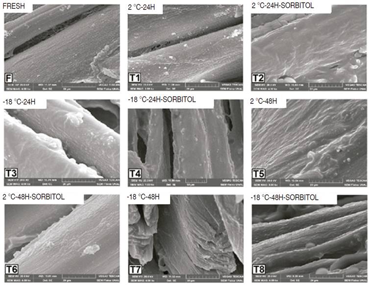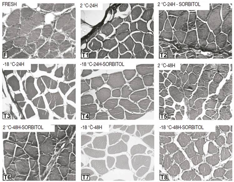 The treatments stored for 24 h at 2 °C with or without the incorporation of sorbitol (T1 and T2) showed the myofibrillar structure in its integral state without the separation of the myotomes, while a slight separation of them is observed in the treatments stored for 24 h at -18 °C (T3 and T4). Besides, the changes in the organization of muscle fibers were evidenced in treatments stored at 2 °C for 48 h (T5 and T6). For the treatment stored at -18 °C for 48 h (T7) showed a greater separation of myotomes and myofibrils than the treatment that had the incorporation with sorbitol at the same temperature and storage time conditions (T8), where the separation of the myofibrils was not so evident (Figure 7).
