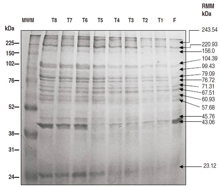 Up to 14 bands were detected in polyacrylamide gel electrophoresis (Figure 9). The bands with the highest molecular weight (243.54 and 220.93 kDa) were found in all treatments, with a higher intensity in treatments stored for 48 h (T5, T6, T7, and T8). In addition, bands with lower molecular weight (156.08 kDa, 104.39 kDa, 99.43 kDa, 79.09 kDa, 76.72 kDa, 71.31 kDa, 67.51 kDa, 60.93 kDa, and 57.68 kDa) were found in all treatments, especially in those subjected to -18 °C (T3 and T4) and with a slightly higher intensity in treatments subjected to -18 °C for 48 h without sorbitol incorporation (T7 and T8). Bands with a molecular weight of 45.76 and 43.96 kDa with low intensity were presented for treatments stored at 2 °C for 24 h (T1 and T2). The same bands were slightly more intense for the treatments stored at -18 °C for 24 h (T3 and T4) and a higher intensity for the treatments stored at 2 and -18 °C and with (T6 and T8) or without (T7).