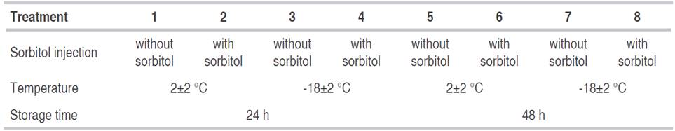 The fillets were stored at 2±2 °C and -18±2 °C, for 24 and 48 h with the injection of a 60% sorbitol solution (Sorbitol USP 70%, Ciacomeq SAS) until achieving an absorption of 5% (w/w). In total, eight treatments with three repetitions each were performed (Table 1).