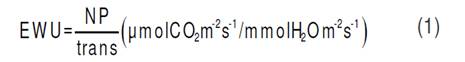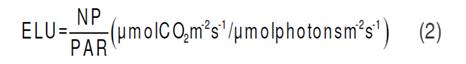 The following photosynthetic variables: photosynthetically active radiation, PAR (µmol m-2 s-1), stomatal conductance, gs (mmol m-2 s-1), intercellular carbon, Cint, net photosynthesis, NP (µmol m-2 s-1), and transpiration, trans (mmol m-2 s-1), were measured simultaneously between 8:00 and 17:00 h (Ellis et al., 2000; Krause et al., 2001; Marenco et al., 2003; Juhrbandt et al., 2004; Araque et al., 2009). A healthy mature leaf in the upper third of the canopy was selected for each using an infrared gas analyzer (IRGA, TPS - 2 PPSYSTEMS). Efficient water use (EWU) and efficient light use (ELU) (Larcher, 1995; Lambers et al., 2008) were calculated using the equations: