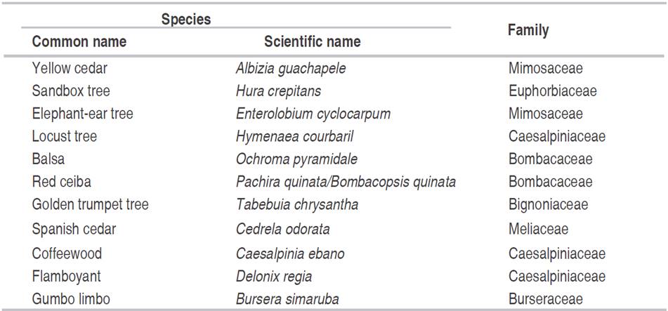 Cedrella odorata L, Uso eficiente de la luz, Uso eficiente del agua, Ochroma pyramidale (Cav. Ex Lam.), Pachira quinata Jacq.The dry tropical forest (TDF) consists of continuous forest cover and is found in regions with an average annual temperature higher than 27 °C and average annual precipitation of 1058 mm (Stoner and Sánchez-Azofeifa, 2009). The dry tropical forest is one of the ecosystems most threatened by anthropic activities because its soils are fertile and well-suited for agriculture (Calvo-Alvarado et al., 2009; Quesada et al., 2009). It is estimated that 48.5% of the world’s TDF have been used for different purposes than its conservation (Portillo-Quintero and Sánchez-Azofeifa, 2010). These disturbances have given rise to plant distinct covers from those naturally found in TDF because natural regeneration processes do not ensure a return to the original state (Griscom and Ashtom, 2011). Nearly 1,000,000 km2 of the world’s remaining TDF is threatened by the expansion of human populations, habitat fragmentation, and climate change, and just 30% of TDFs are protected under conservation regimes (Fajardo et al., 2013). Besides, 350 million ha have been deforested, and another 500 million ha of primary and secondary forest has been degraded (Lamb et al., 2005). Restoration and replanting native species are strategies that can guarantee the continued provision of environmental goods and services, in addition to protecting and recovering native flora (Bastien-Henri et al., 2010). These strategies have produced positive results, including the recovery of soils and nutrients and the establishment of plant cover and water balance in degraded areas (dos Santos et al., 2006).