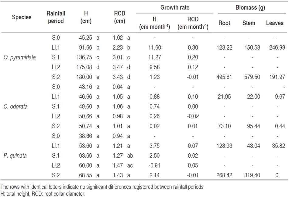 P. quinata species has been adapted to weather conditions, and it is resistant to low rainfall rates, which facilitated its establishment in this degraded area. In the dry regions, low mortality values have been reported for P. quinata (Hall et al., 2011). At the same time, Kane et al. (1993) noted that this species maintains considerable reserves of starch in its root system, which allow it to have a rapid initial growth at the beginning of the rainy season. Consistently, an increase in growth rate was observed during the Ll.1 period. The strategy employed by the plant was the reduction of its leaf biomass during the dry periods to combat hydric stress. According to Eamus (1999), stomatal sensibility in caducipholic plants increases with soil dryness, and a result attributed to the decrease in elasticity of their cell walls that in turn results in a high propensity to the loss of turgidity. P. quinata specimens exhibited the greatest diameter, coinciding with the findings of Wishnie et al. (2007) in a study of 24 species with restoration potential and commercial value. P. quinata is a species that acclimate to conditions of high solar radiation and low humidity (Kane et al., 1993). Although soil fertility was not evaluated in the present research, it could be a factor that impacts its growth (Hall et al., 2011). O. pyramidale performed the best in terms of height due to the ease with which it acclimates (Krause et al., 2001). The results obtained are consistent with the findings of Wishnie et al. (2007) in Panama in a study of TDF species that also included C. odorata and P. quinata. These findings also confirm that O. pyramidale is a fast-growing species that acclimate well to dry areas.